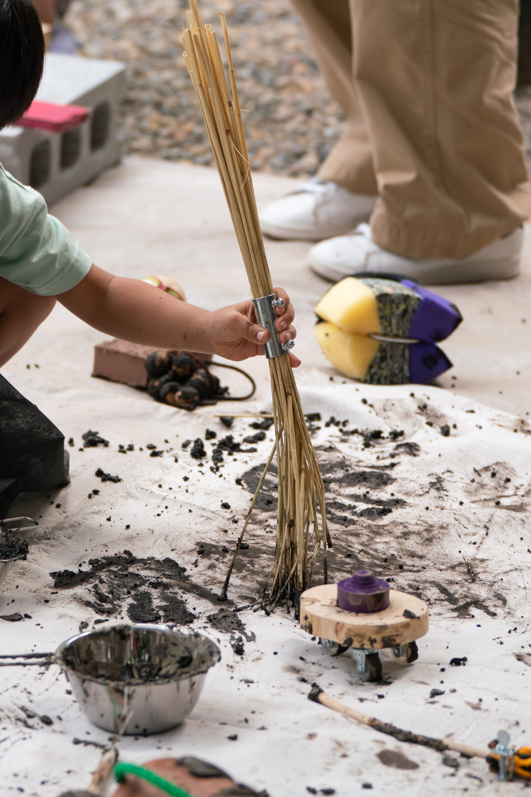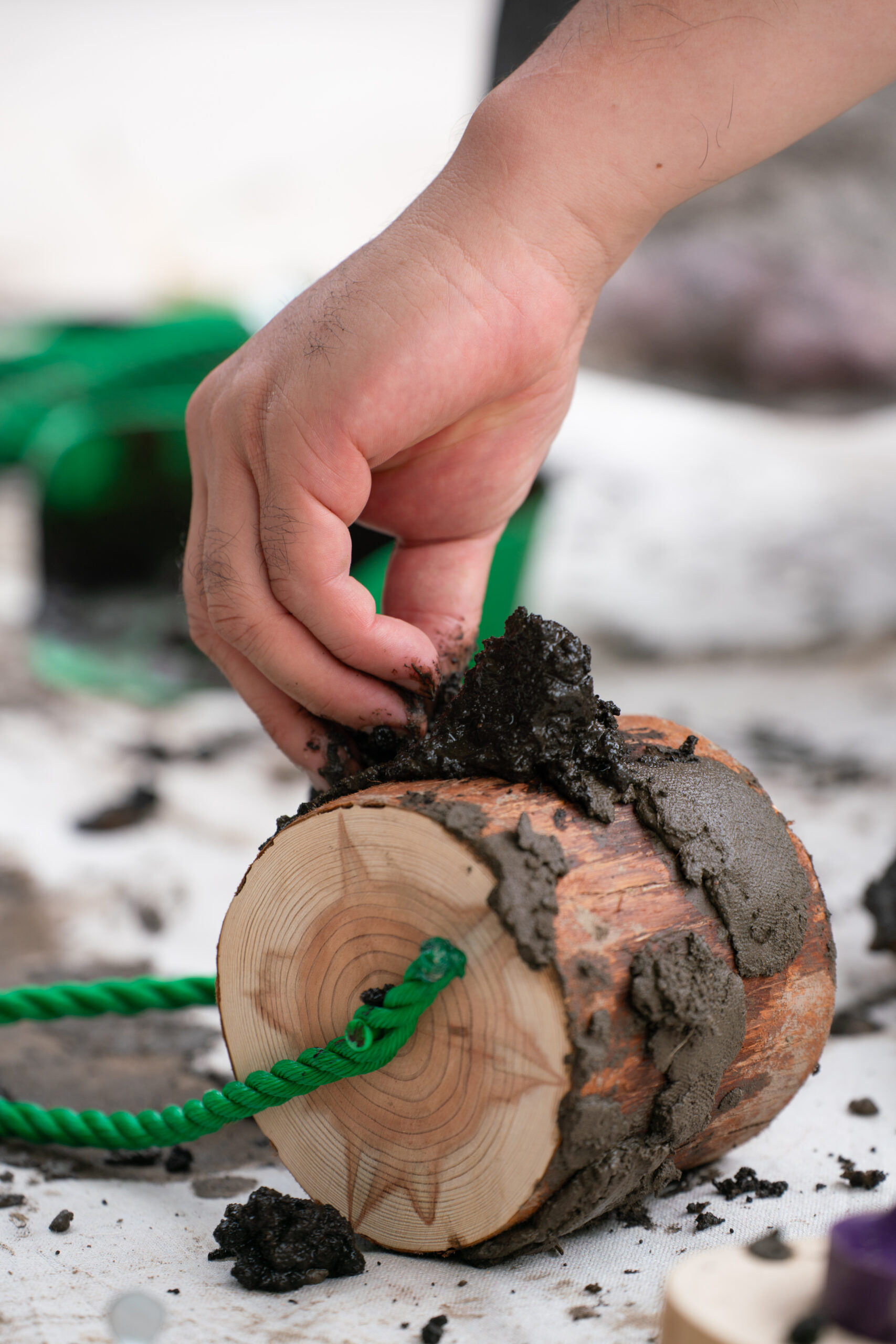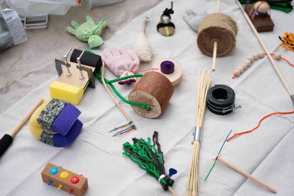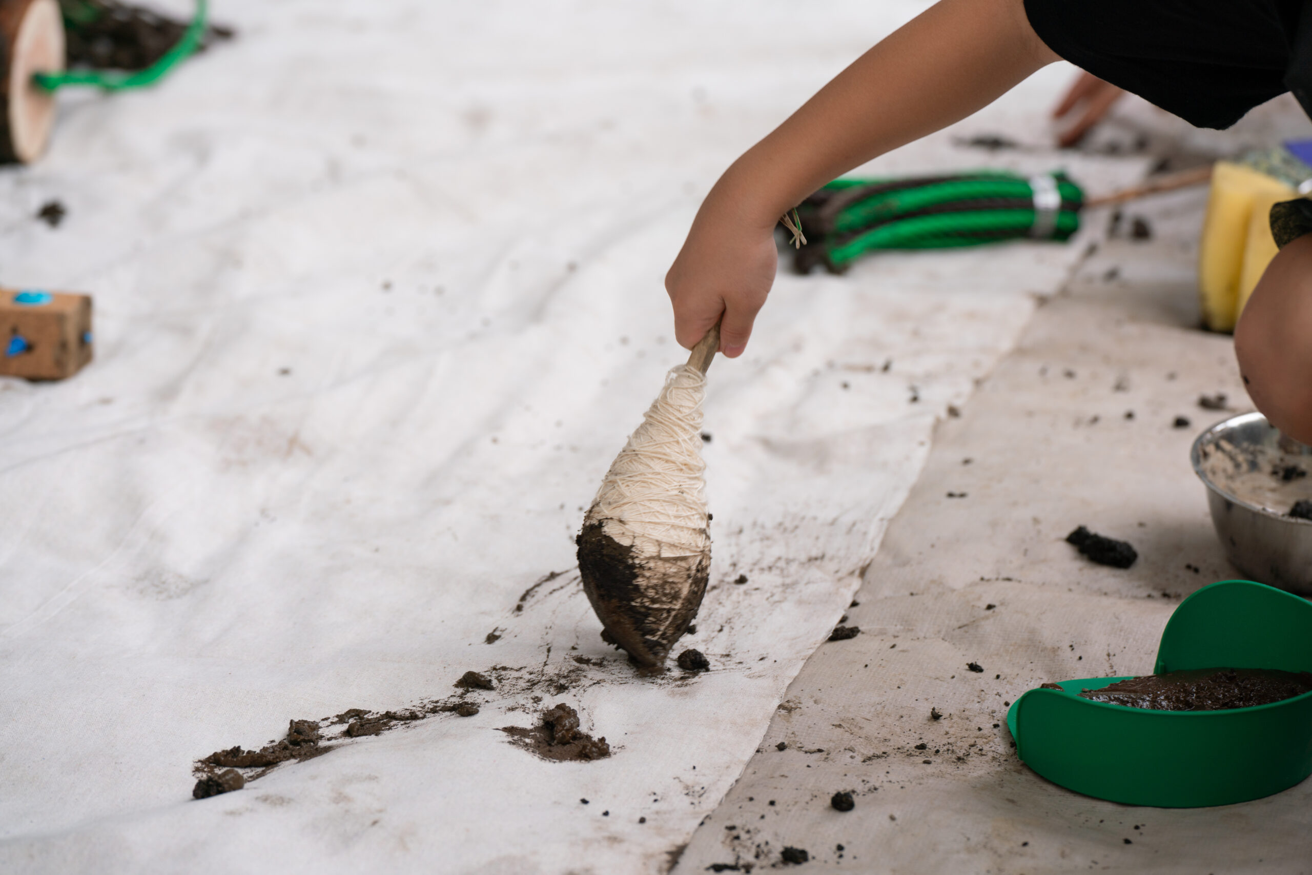 土は土地の記憶を抱えた素材であり、粒子、色、触感、乾燥の仕方まで一つひとつ違う。制作した道具もまた、「何に使うか不明」「持ちにくい」「予測できない」といった不確かさを抱えている。その思い通りにならなさの中で私たちは、目で正解を探すより先に、手触りや抵抗から判断し、素材と交渉しながら進むことになる。
